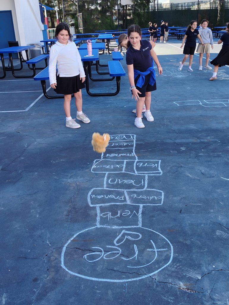 The third graders have been learning to identify the different parts of speech. They participated in kinesthetic and multisensory grammar activities to reinforce this target skill. The students created color coded lists of the words they came across as they read leveled passages and select pages of their chapter books. Each part of speech was defined using a color, and we discussed the functions of these words within a sentence. Students learned the importance of constructing simple, compound, and complex sentences in their written pieces. To further reinforce this skill, students played the Grammar Hopscotch game. Each group of students drew the familiar Hopscotch pattern of rectangles on the ground, and then they proceeded to play. The rules followed those of the traditional game, with the exception that each square represented a different part of speech. Students called out a noun, pronoun, adverb, verb, or adjective, depending on where the toy bear they threw landed. They had time to think of a word, as they hopped to the rectangle. They also had to use that word in a sentence. Categories (tags): AcademicsElementary
